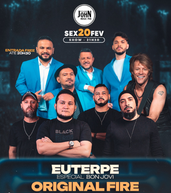 Especial Bon Jovi com Banda Euterpe Oficial e grandes clássicos do rock com Banda Original Fire. Noite para quem quer guitarras altas e energia lá em cima.