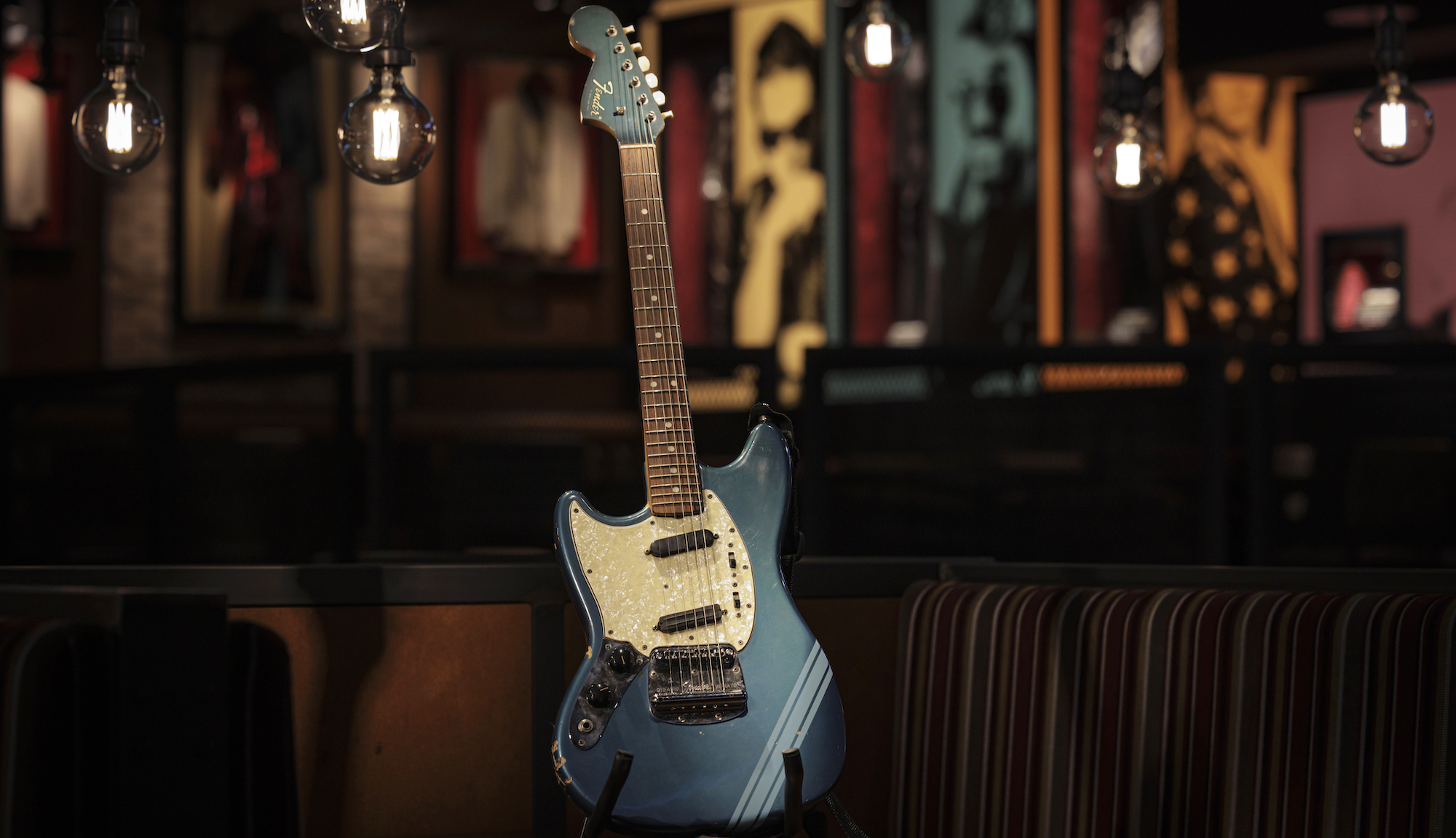 Cobain adquiriu o instrumento pouco antes do lançamento de Nevermind (1991), disco que redefiniu o cenário do rock alternativo no início dos anos 1990 e projetou o Nirvana para o estrelato mundial. A Mustang azul ganhou notoriedade ao aparecer no videoclipe de “Smells Like Teen Spirit”, produção que se tornou um dos vídeos mais influentes da cultura pop.